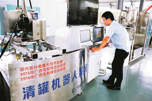 打造首臺套高壓清洗機器人。2014年底,高壓清洗機器人系統在廣西上上糖業有限公司正式投入榨季運行,標志著高壓清洗機器人系統研發成果順利實現產業化推廣。該系統是完全自主研發,共獲21項專利(其中發明專利5項),獲廣西專利博覽會金獎專利2項,并于2015年獲得自治區工信委國內首臺(套)重大技術裝備認定,2018年獲得廣西創新發展驅動(重大)專項支持。高壓清洗機器人系統是面向國內外制糖、輕工、食品、化工、制藥等行業,在狹小受限空間、高溫潮濕環境下,代替人工清洗加熱管機構的機器人,屬世界首創,達到代替傳統人工作業方式、減少人員傷亡、提高安全生產率和提升清洗質量的效果。目前,該系統已在廣西、云南、新疆等主要制糖產區企業大量應用,并出口泰國、越南、緬甸等國家,受到海外客戶高度認可,打造了廣西制糖智能裝備的優質品牌。