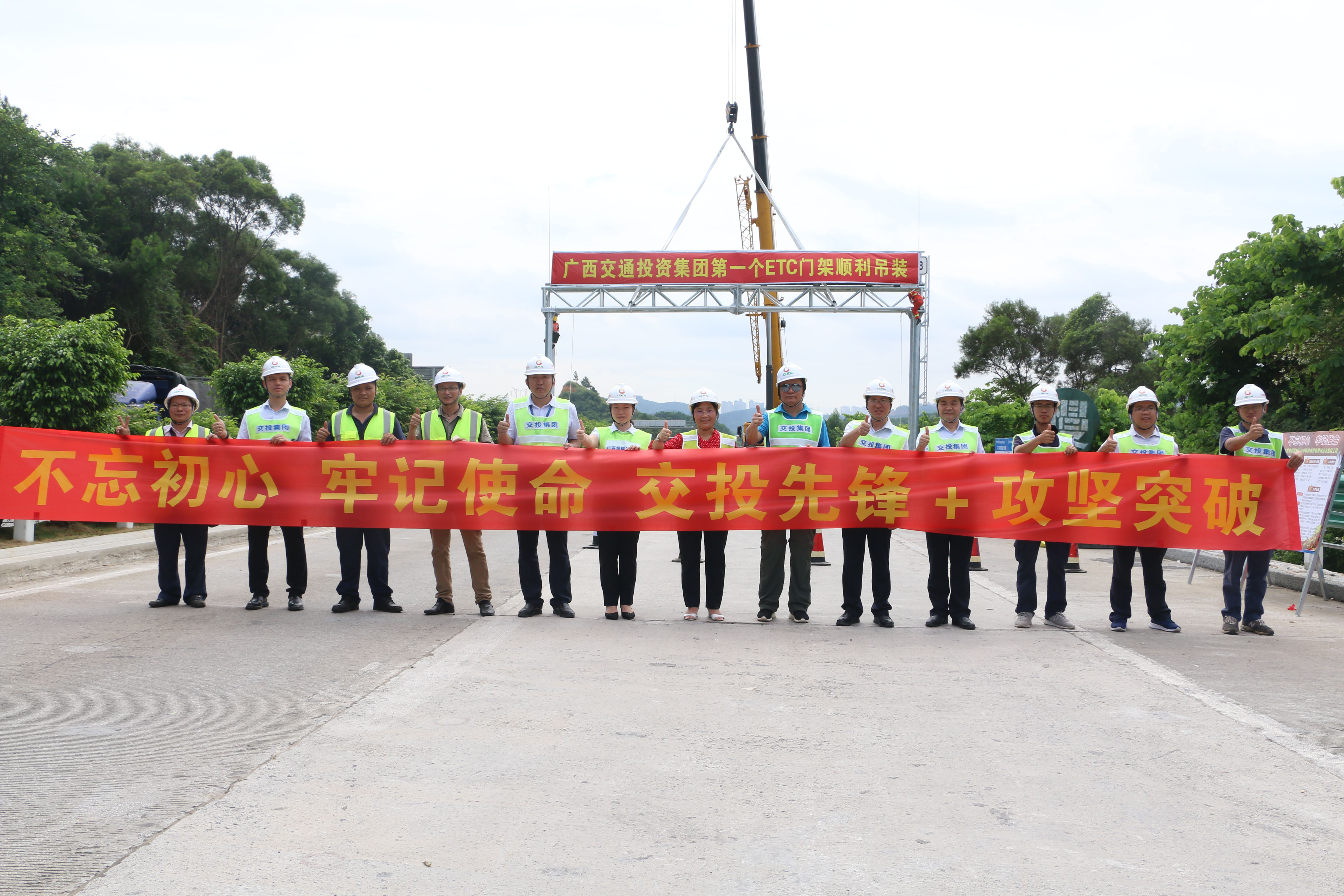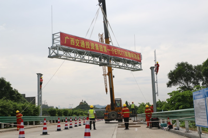 2019年7月23日,廣西交通投資集團有限公司(以下簡稱交投集團)取消高速公路省界收費站應急搶險工程第一個ETC門架在南寧片區(qū)五象西至高嶺高速路段K45+500處順利吊裝,交投集團副總經(jīng)理周志剛親自到現(xiàn)場指揮吊裝工作,集團公司運營部、南寧運營公司、交投科技公司、智通公司、計算中心、機械院公司、廣西交科院等有關單位代表到場見證。此次ETC門架順利吊裝標志著交投集團自由流虛擬收費站進入關鍵施工階段,也標志著機械院公司生產(chǎn)制作的龍門架成功登陸市場,并為后期的龍門架安裝作了標準化示范。