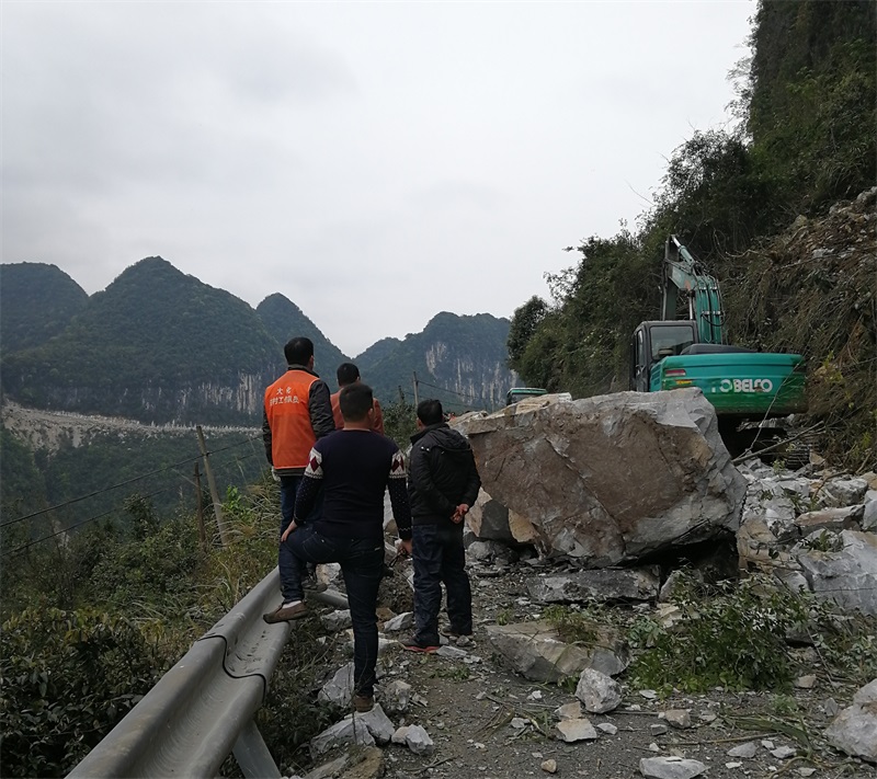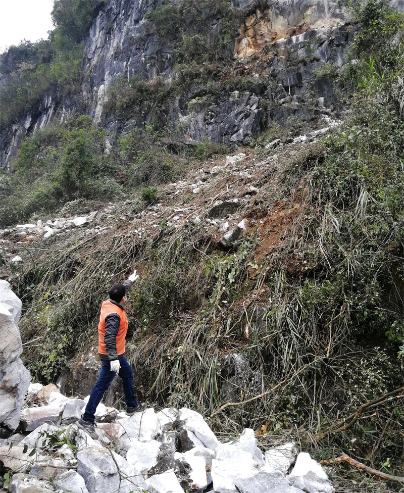 情況危急,覃敢立刻放下手中的工作,與3名工作隊(duì)員匆忙前往塌方地點(diǎn)。原來(lái)這是由地質(zhì)災(zāi)害引發(fā)的山體崩塌,山上滑落的石頭已將道路埋沒(méi),受阻路段大約有10米。在詳細(xì)偵查塌方現(xiàn)場(chǎng)情況,確認(rèn)現(xiàn)場(chǎng)無(wú)人員傷亡后,覃敢心中松了一口氣。