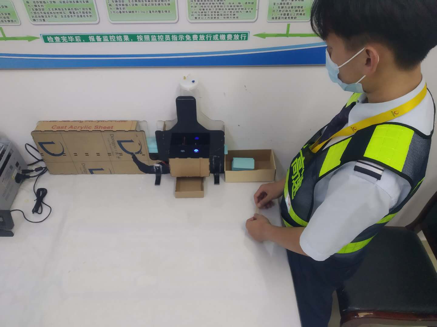疫情期間,CPC卡的酒精擦拭消毒是收費員的新工作內容,現也成為了常態化疫情防控的工作任務。人工擦拭消毒效率低,占用時間較多,為提高效率,雙方合作研發了CPC卡自動消毒機,該產品可實現自動送卡,擦拭酒精等功能,每小時可消毒600張CPC卡。