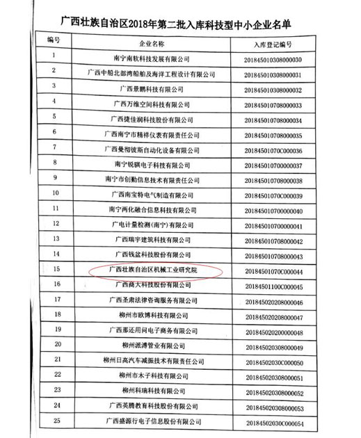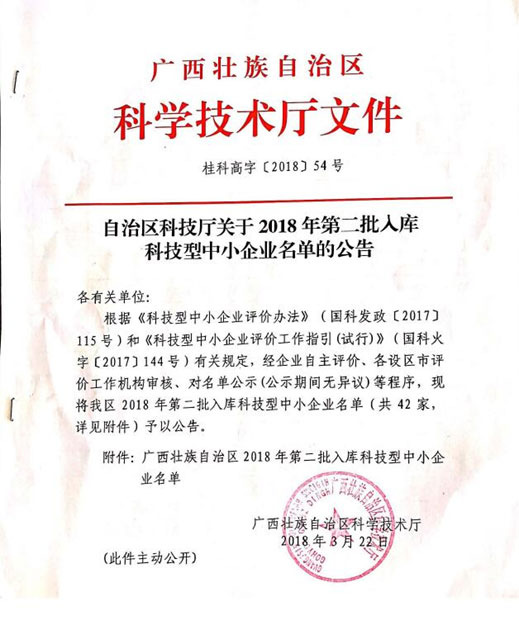 近日,廣西科技廳公告了2018年第二批入庫科技型中小企業的名單,我院入庫該名單之列。