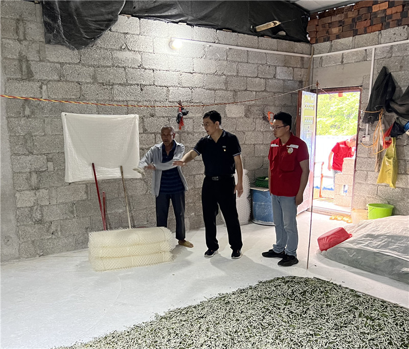在走訪峰洋村各漏屯集中養蠶點的過程中,景東平副董事長詳細詢問了蠶房租金、養殖規模和產值等情況,了解到峰洋村通過建造蠶房租賃給蠶農,已經形成每年2-3萬元的村集體收益,同時也滿足了蠶農發展養殖業產業的場地需求,他表示這是互利互惠的好思路好做法,要持續進行下去。景東平副董事長還叮囑駐村幫扶干部做好產業政策宣傳,和后盾單位要密切配合,幫助農戶拓寬產品銷路,提升“自我造血”功能,將峰洋村桑蠶產業做優做強。