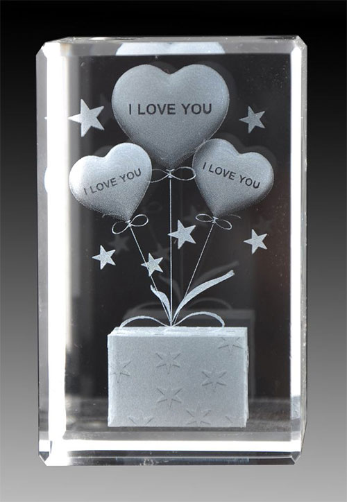在水晶、玻璃等透明材料內雕刻平面或三維立體圖案。