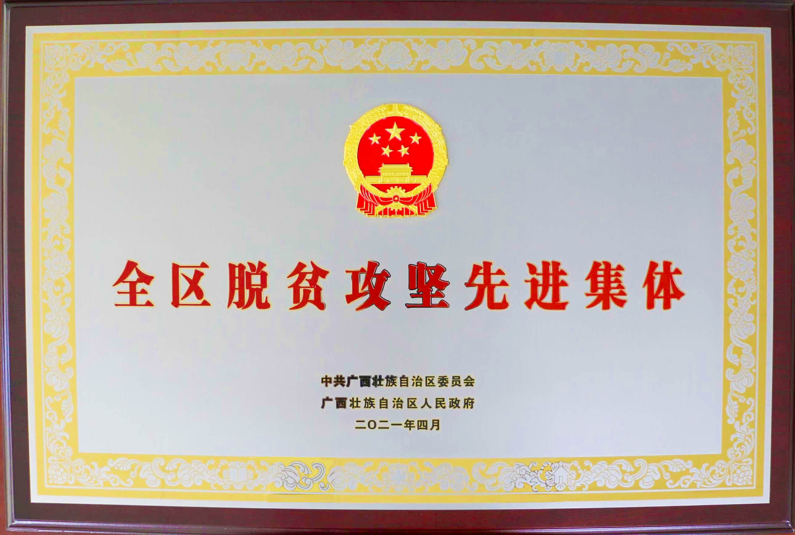 2021年5月7日,全區(qū)脫貧攻堅(jiān)總結(jié)表彰大會(huì)召開(kāi),會(huì)議表彰了一批脫貧攻堅(jiān)先進(jìn)集體、先進(jìn)個(gè)人,廣西機(jī)械工業(yè)研究院有限責(zé)任公司榮獲自治區(qū)黨委、自治區(qū)政府授予的“全區(qū)脫貧攻堅(jiān)先進(jìn)集體”榮譽(yù)稱號(hào)。